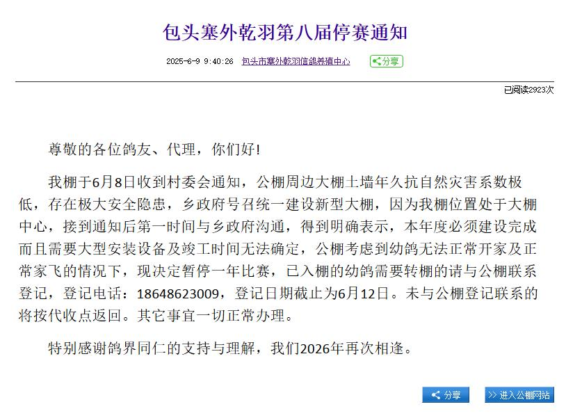 6月9日上午9点,包头塞外乾羽公棚发布一则通知,宣布2026年第八届停赛,声称:由于公棚于6月8日收到村委会通知,公棚周边大棚土墙年久抗自然灾害系数极低,存在极大安全隐患,乡政府号召统一建设新型大棚。由于本年度必须建设完成,而且需要大型安装设备及竣工时间无法确定。公棚考虑到幼鸽无法正常开家及正常家飞的情况下,现决定暂停一年比赛。