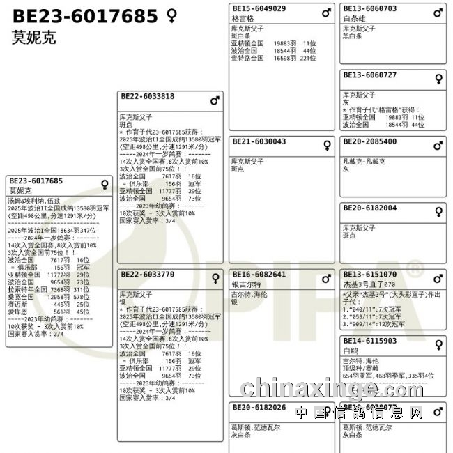 当地时间6月16日14时55分,汤姆&埃利纳.伍兹(Wuyts Tom & Eline) 的BE-23-6017685打钟报到,波治II2025成鸽组全国冠军诞生,空距为498.282公里,平均分速为1291.44米/分。