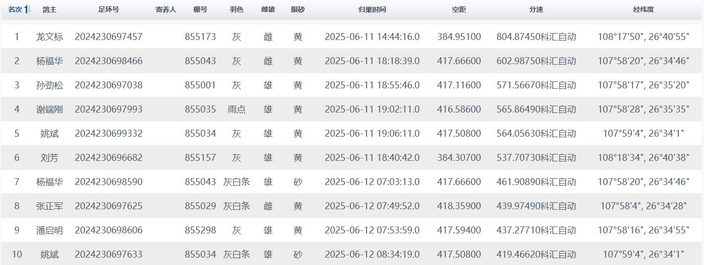 来自贵州黔东南州凯里市信鸽协会的龙文标鸽友名下的2024230697457黄眼灰雌于当日14点44分16秒报进,飞行空距384.951公里,分速为804.8745米/分,暂列榜首。