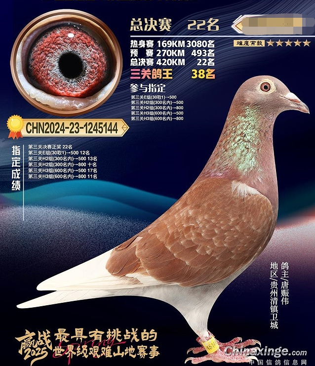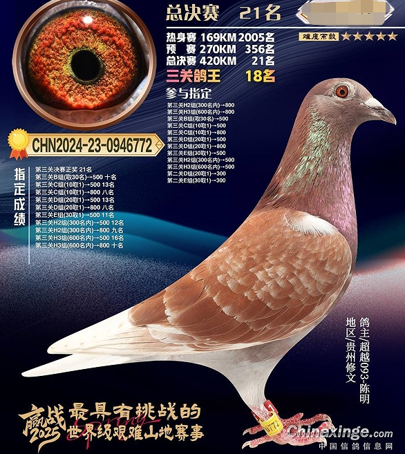 2025年贵州冲冠赛鸽公棚春季决赛硝烟散尽,归巢艰难超乎想象——当日归巢赛鸽仅4羽。凯旋榜上稍显冷清,在官网随后公布的获奖鸽照片中,两抹绛红却如烈焰破晓,瞬间吸引了笔者目光。