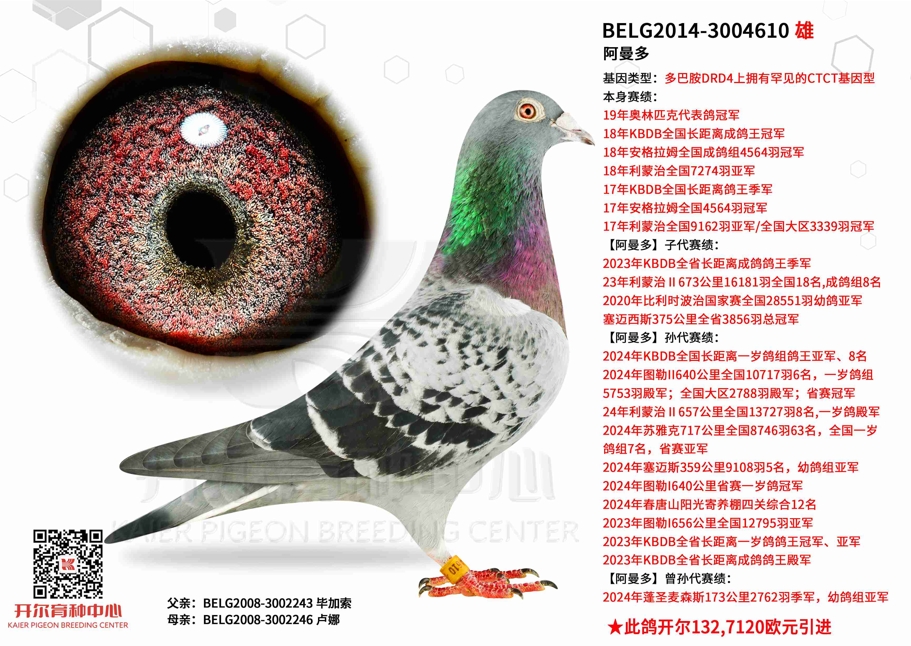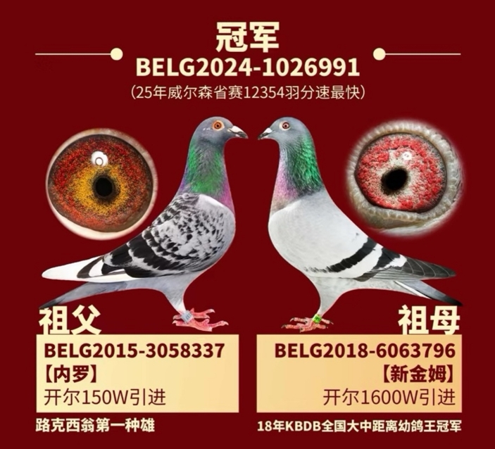冠军是新金姆孙代,此前还获25年亚精顿I全国大区一岁鸽19名,波治Ⅰ全国大区一岁鸽15名,威尔森403公里省赛一岁鸽亚军(与冠军同时归巢)。父亲源自内罗×新金姆。25年欧赛新金姆家族战绩显赫,先后斩获苏瓦松冠军、蒙塔基冠军、威尔森一冠一亚(同时归巢)、苏瓦松亚军、波治Ⅱ全国大区冠军,4冠2亚收入囊中!