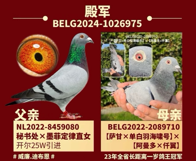 殿军是威廉迪布恩与阿曼多的强强联合,父亲是天王星直子秘书处与墨菲定律直女墨菲小珍妮的结合。母亲是阿曼多仟翼的孙代,母亲本身23年KBDB全省长距离一岁鸽鸽王冠军。