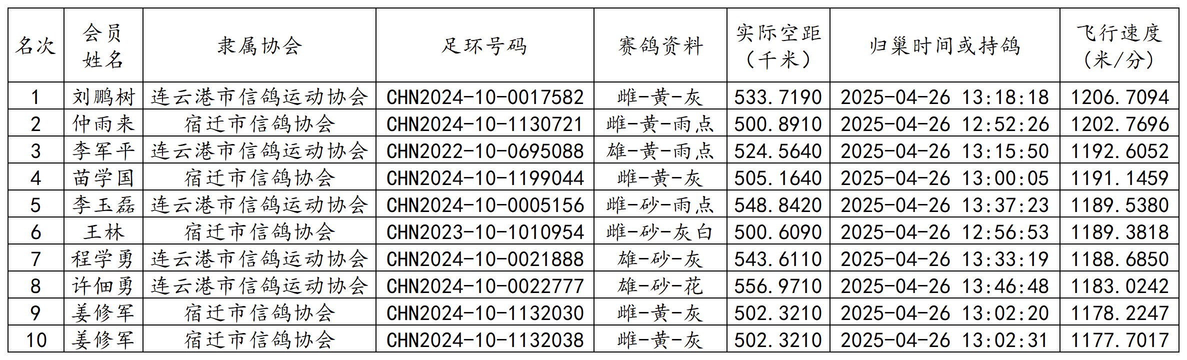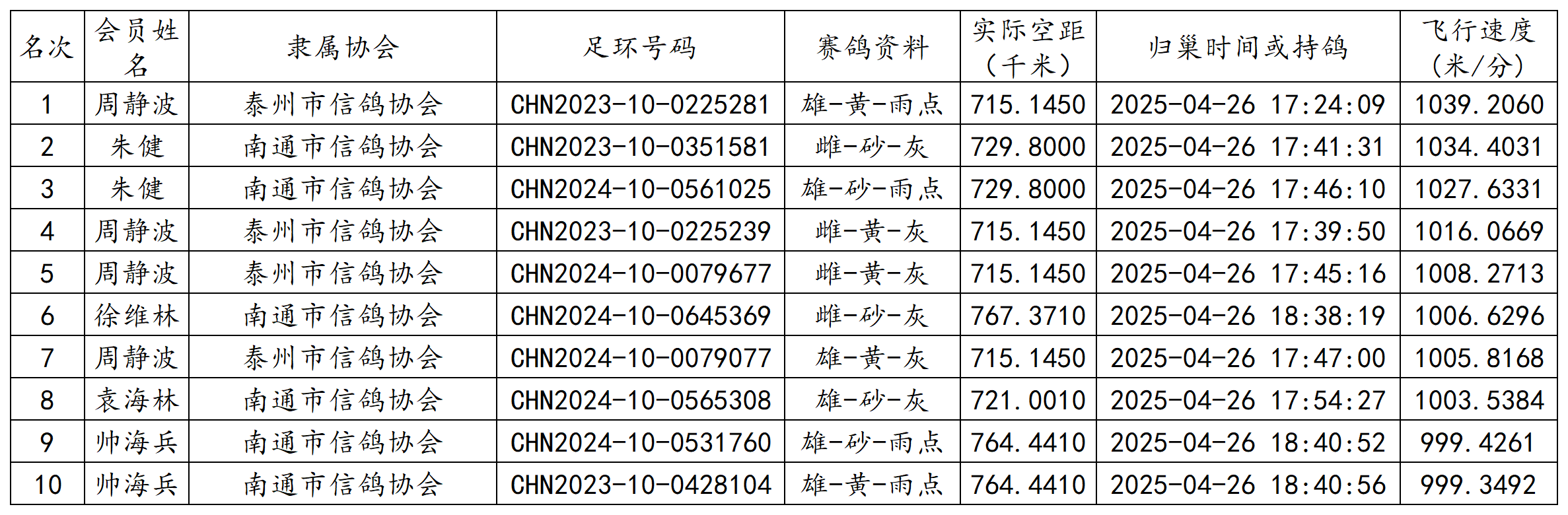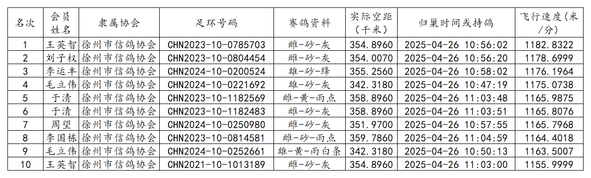 郑州国家赛江苏省各空距级别前十成绩