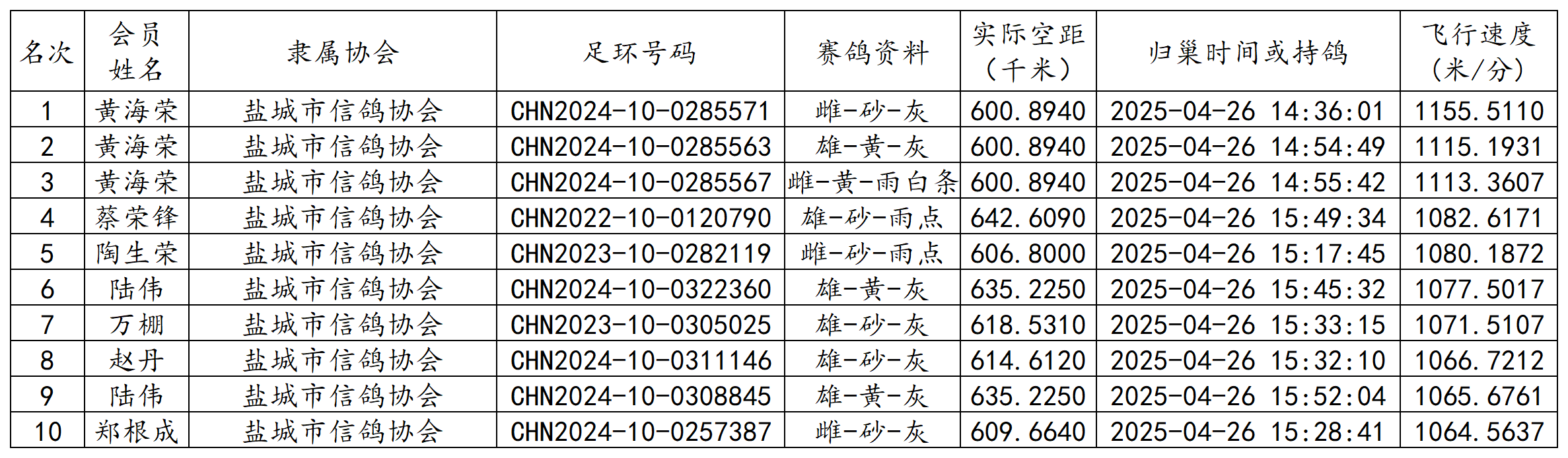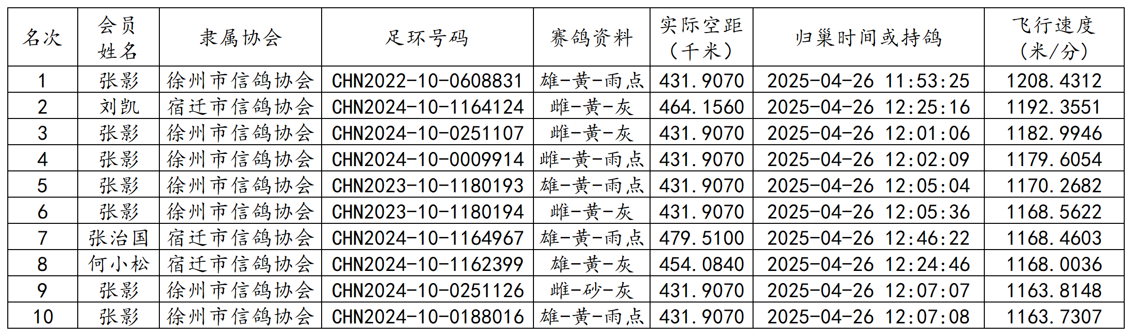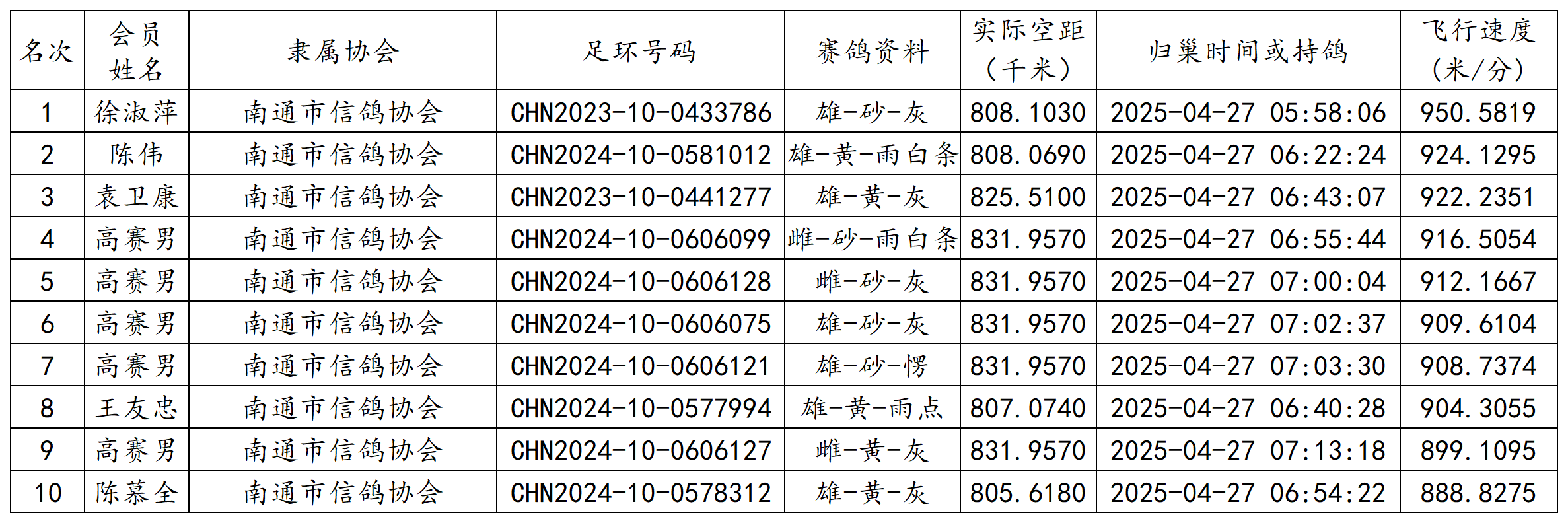 郑州国家赛江苏省各空距级别前十成绩