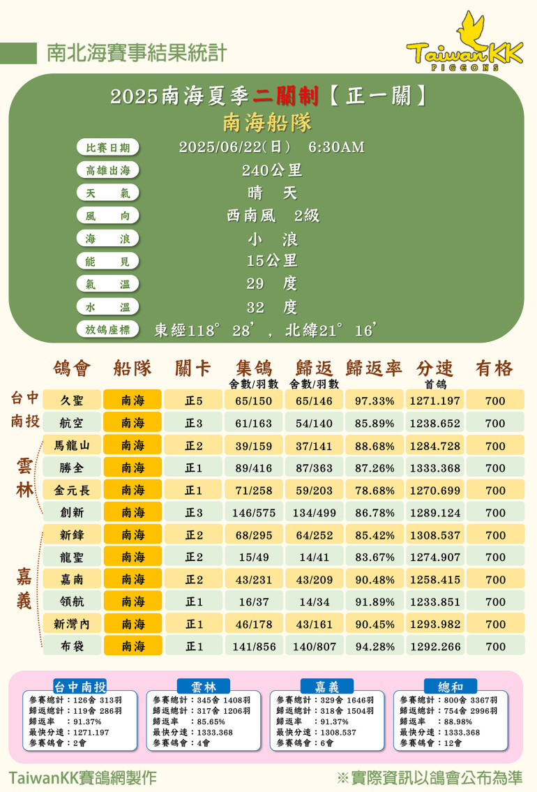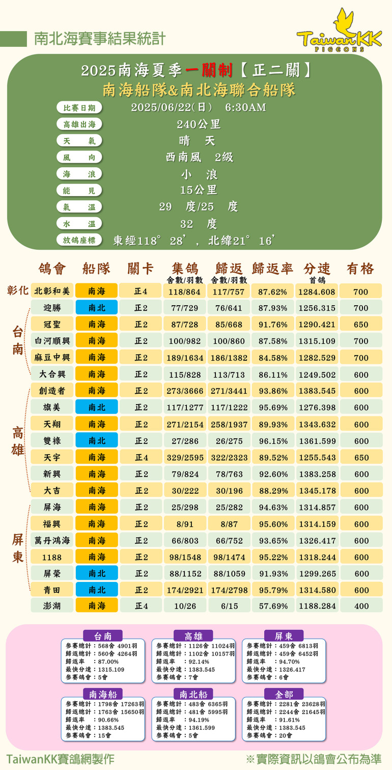 台南、高雄、屏东共计20个鸽会举行一关制比赛,本关比赛总计2281舍、23628羽赛鸽出海比赛。这关比赛在好天气助阵下,飞出了好成绩,最高分速1383.545米/分,有的鸽会归巢率达94.7%。最终,一关制全船共计2244舍、21645羽赛鸽归巢,整体归巢率高达91.61%!