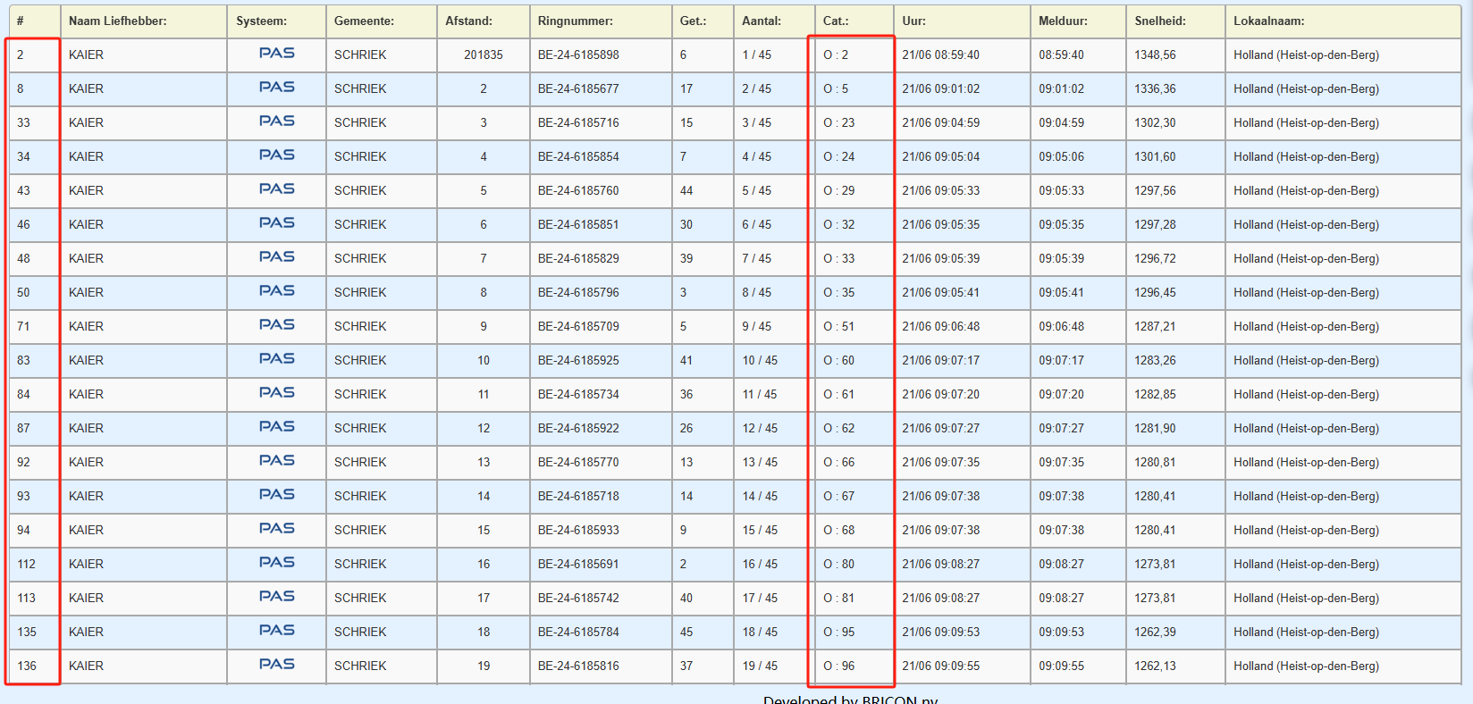 其中,8、33、93名源自阿曼多x新金姆,33名在上场苏瓦松赛事中即崭露头角,获一岁鸽组殿军。46 名同样为新金姆后代,亲兄妹在近期多场国家级赛事中锋芒尽显,获波治‖全国大区一岁鸽冠军,亚精顿瓦隆大区一岁鸽6名、波治工全国大区一岁鸽15名及25年威尔森省赛12354羽分速最快,目前暂列比利时中距离全国赛最佳一岁鸽3场比赛5名。