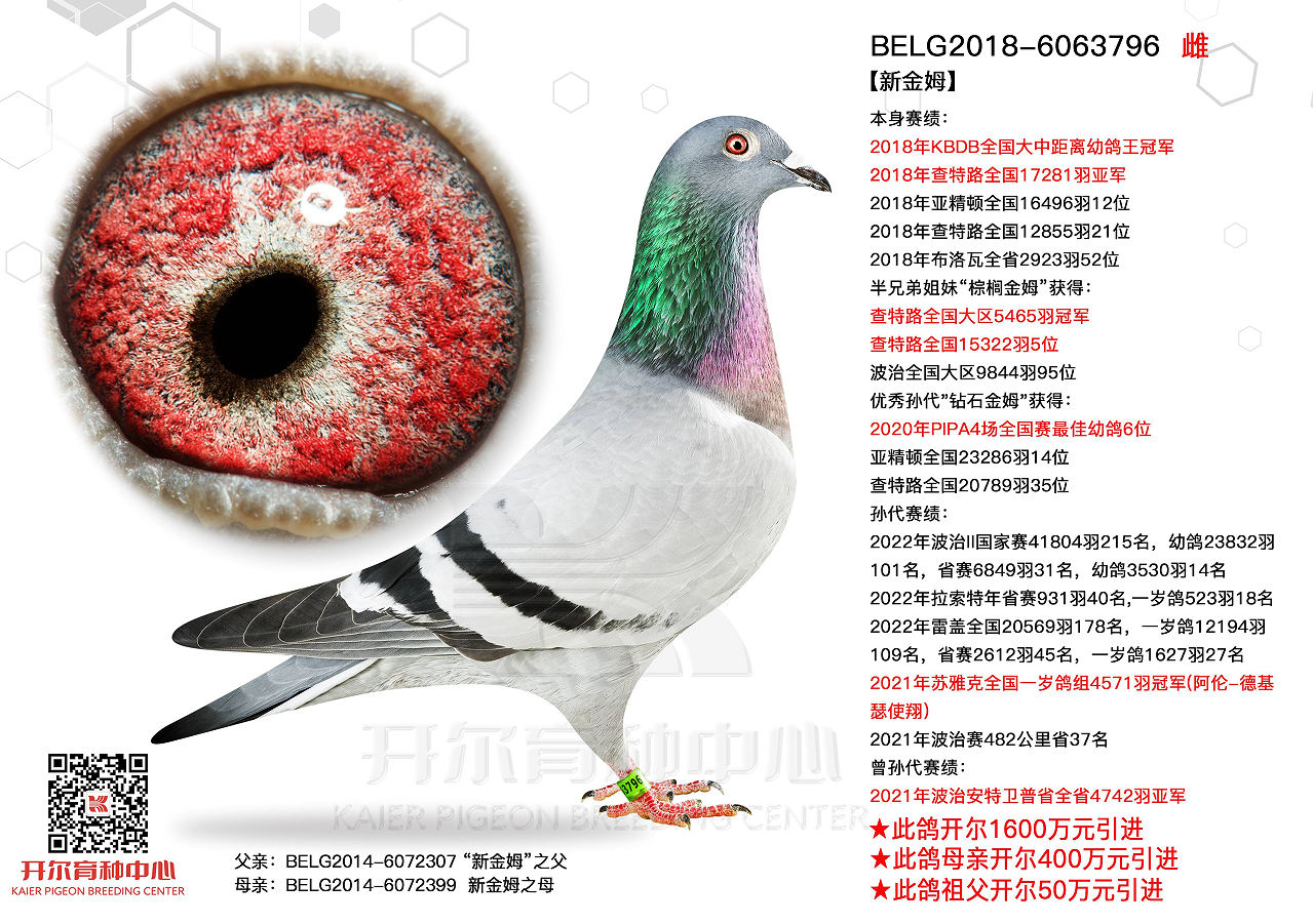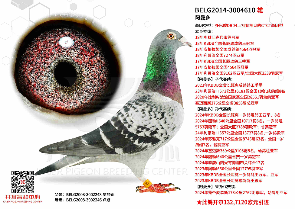 亚军、84名则来自威廉迪布恩,迪拜鸽王家族,源自开尔明星配对金荷鲁斯x墨菲法塔。亚军还获得莫伦12223羽冠军,自身荣获一冠一亚,还荣获波治Ⅱ全国大区一岁鸽9名,苏瓦松一岁鸽5名,以四次前十暂列开尔欧赛红鸽榜首席之位。