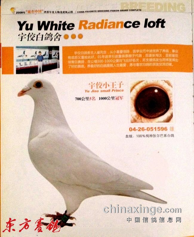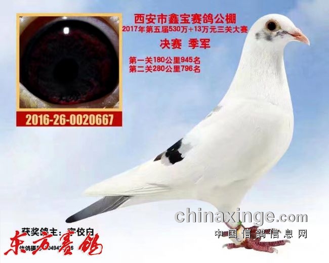 西安三原宇佼白鸽舍在26年的公棚比赛的历程中,以一支纯白鸽系驰骋沙场,并取得理想的赛绩,鸽舍主人崔先生源于对洁白无瑕赛鸽执着的热爱,在赛鸽路上不抛弃、不放弃并不断优化,有着8代生生不息的繁育,这支白色军团从陕西开枝散叶走向了全国。