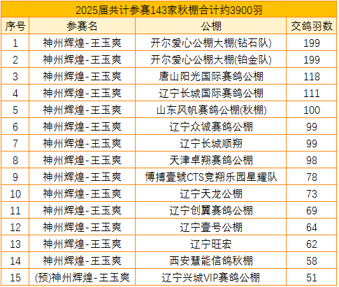 在这份交鸽名单中,交鸽百羽及以上的就有五家,分别是:开尔爱心公棚大棚(钻石队)、开尔爱心公棚大棚(铂金队)、唐山阳光国际赛鸽公棚、辽宁长城国际赛鸽公棚、山东风帆赛鸽公棚(秋棚)。