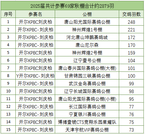 此外,开尔今年交鸽阵容也十分庞大。2025届秋赛参赛约69家秋棚,共计参赛2879羽。交鸽超150羽以上共5家,分别为唐山阳光国际赛鸽公棚248羽、神州辉煌1号棚221羽、河北唐山坤鹏赛鸽城172羽、唐山尼尔森170羽、神州辉煌2号棚159羽。