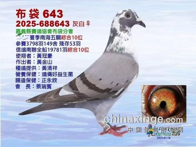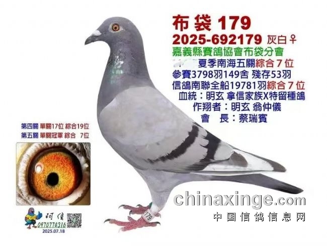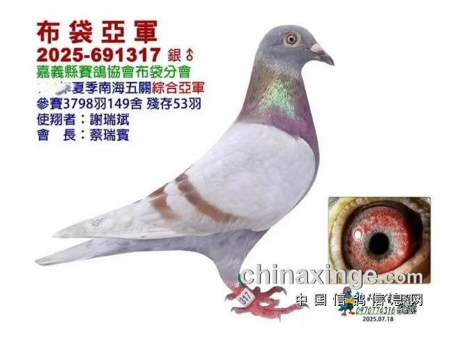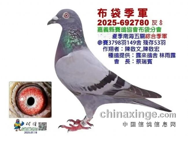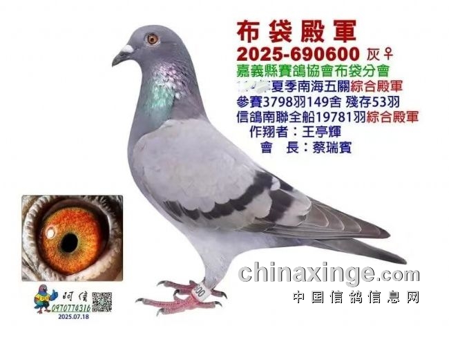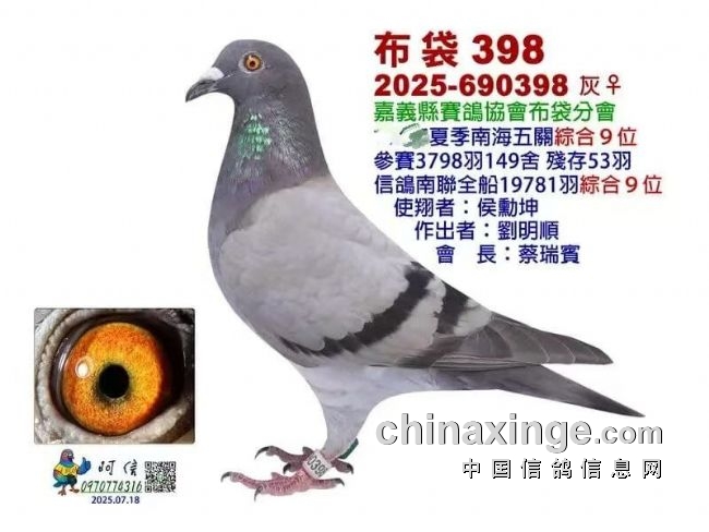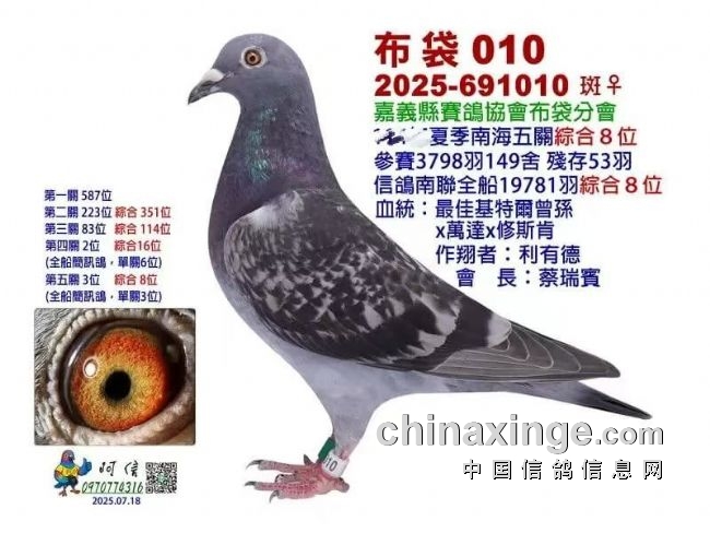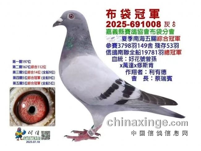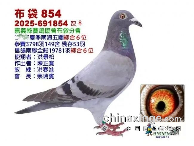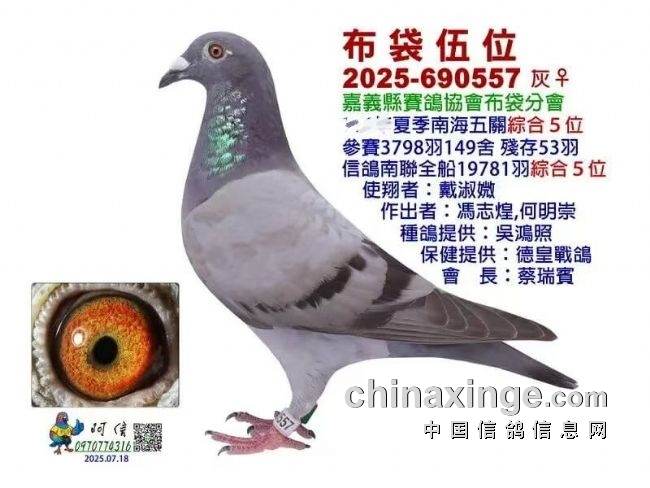 2025年7月13日,夏季南海二关制正五关绝杀关落幕,仅有嘉义布袋鸽会参赛,共派出59羽赛鸽,空距高雄港出海300公里。最终53羽顺利归巢,归巢率达89.83%,为本次赛事画下句点。五关综合冠军花落利有德鸽友名下,这羽赛将以首关197名、二关167名、三关5名、四关5名、五关5名,位列五关综合榜首,为“好花号”曾孙。