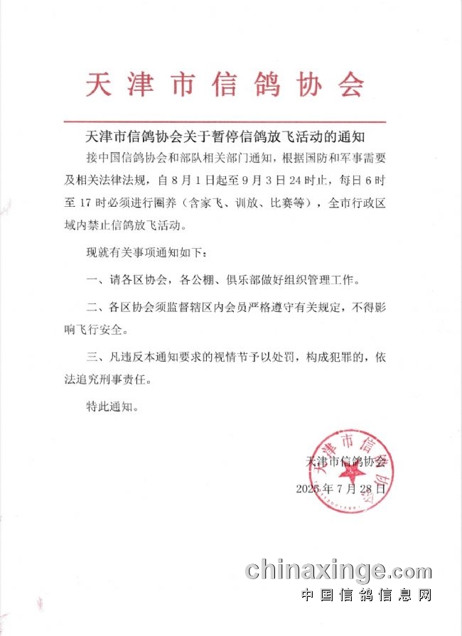 天津信鸽协会发布公告,宣布“自8月1日起至9月3日24时止,每日6时至17时必须进行圈养(含家飞、训放、比赛等),全市行政区域内禁止信鸽放飞活动” 以下是公告详细内容: