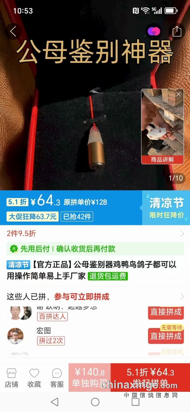 最近,突然发现此产品在拼多多上挂牌销售,名字是“公母鉴别神器”,特别注明鸡鸭鸟鸽子都可以用,可以先用后付,销售热度不减当年。