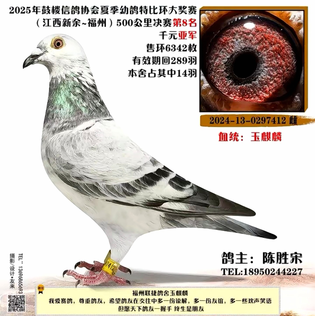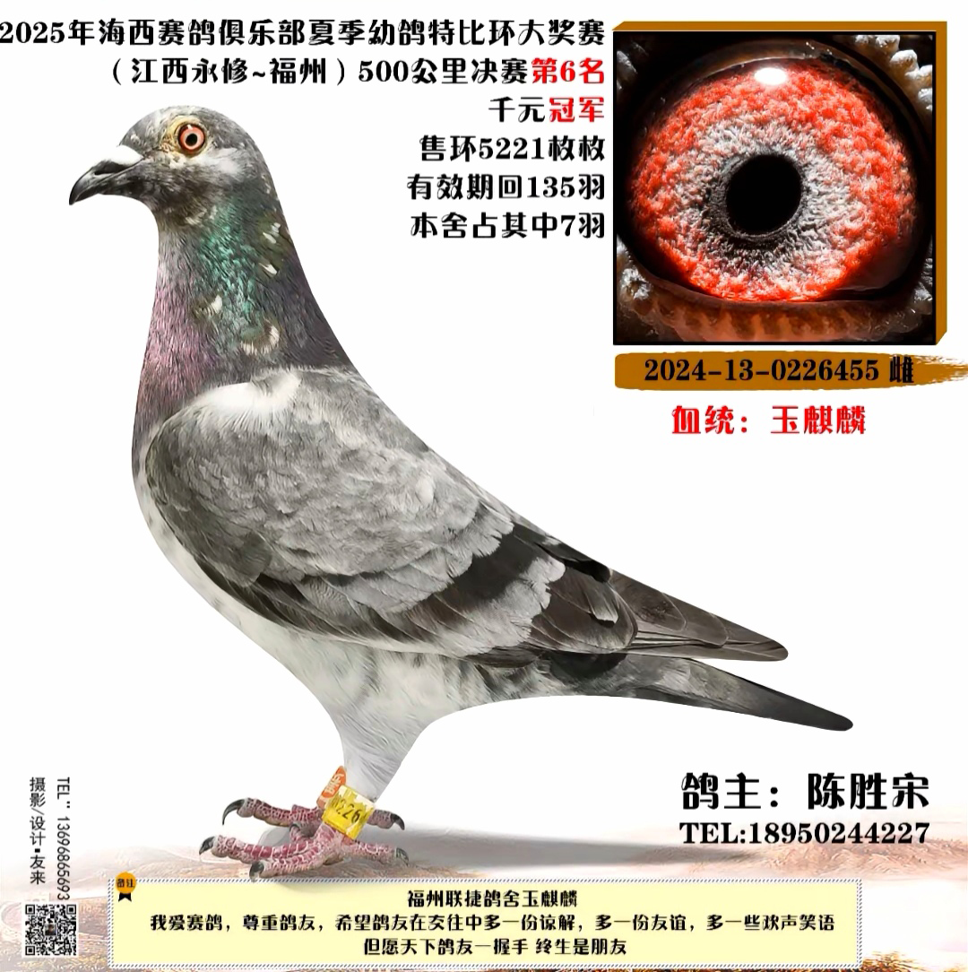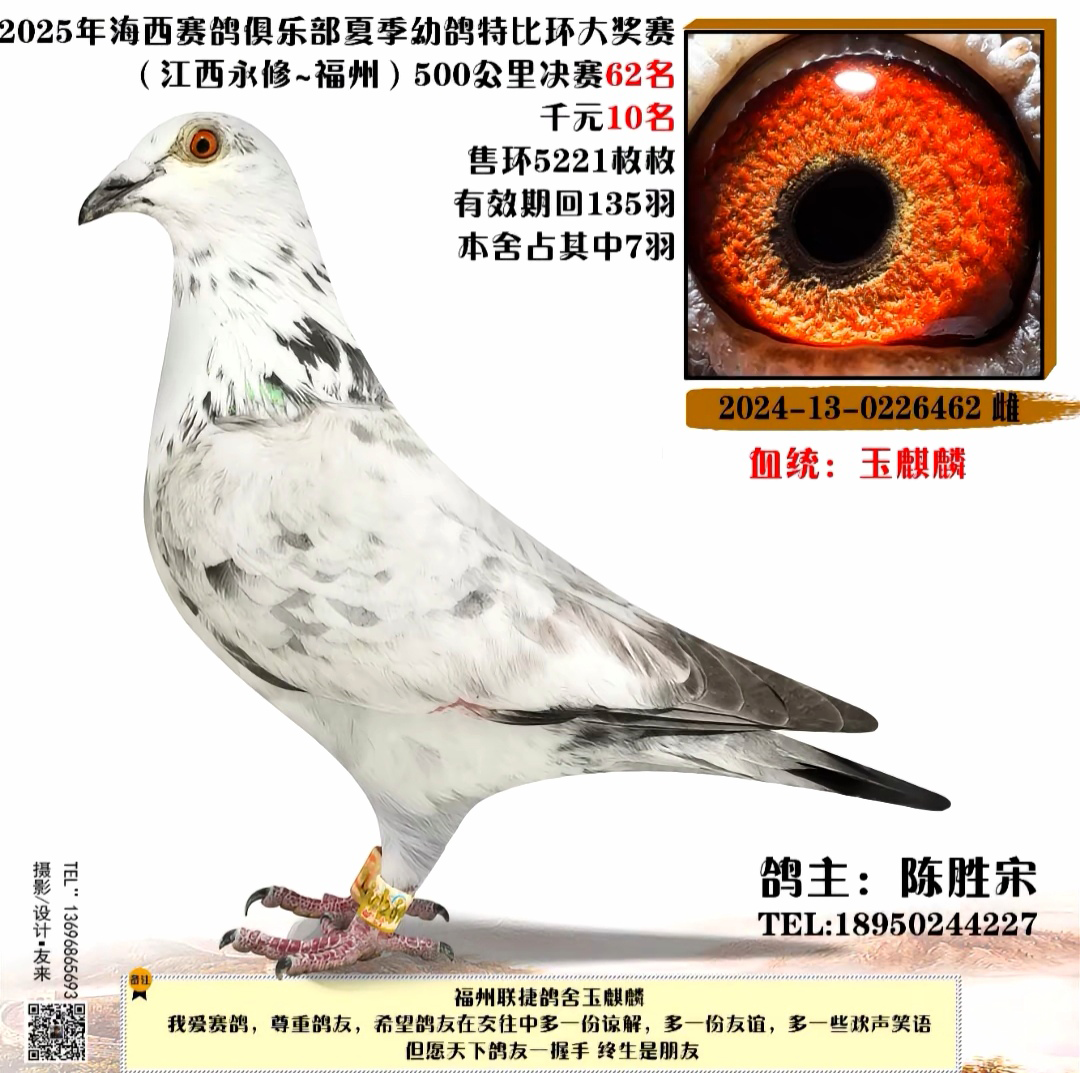 鸽主取得如此骄人战绩,并非偶然,玉麒麟血系不止一次在赛场上证明自己——次次出征,皆有回响!今年,鸽主在海西赛鸽俱乐部夏季幼鸽赛也斩获高位,500公里决赛有效归巢仅135羽。陈胜宋独占7羽,4羽闯入前百,最好成绩是第6名,另有62、75、94名等高位入赏。