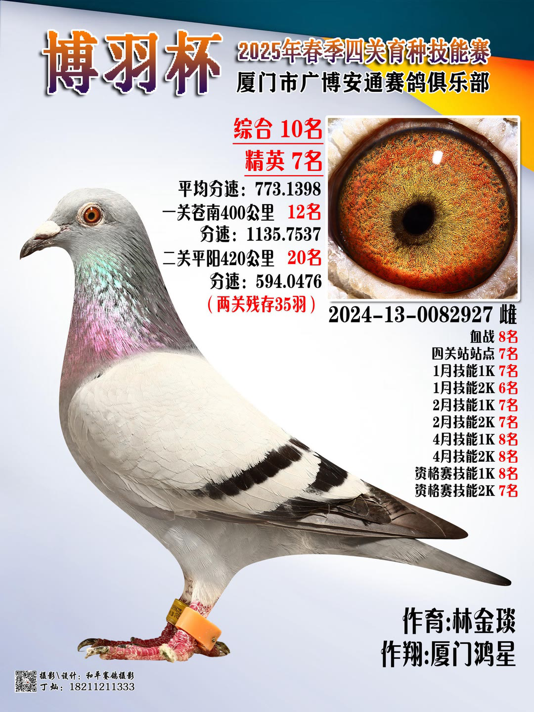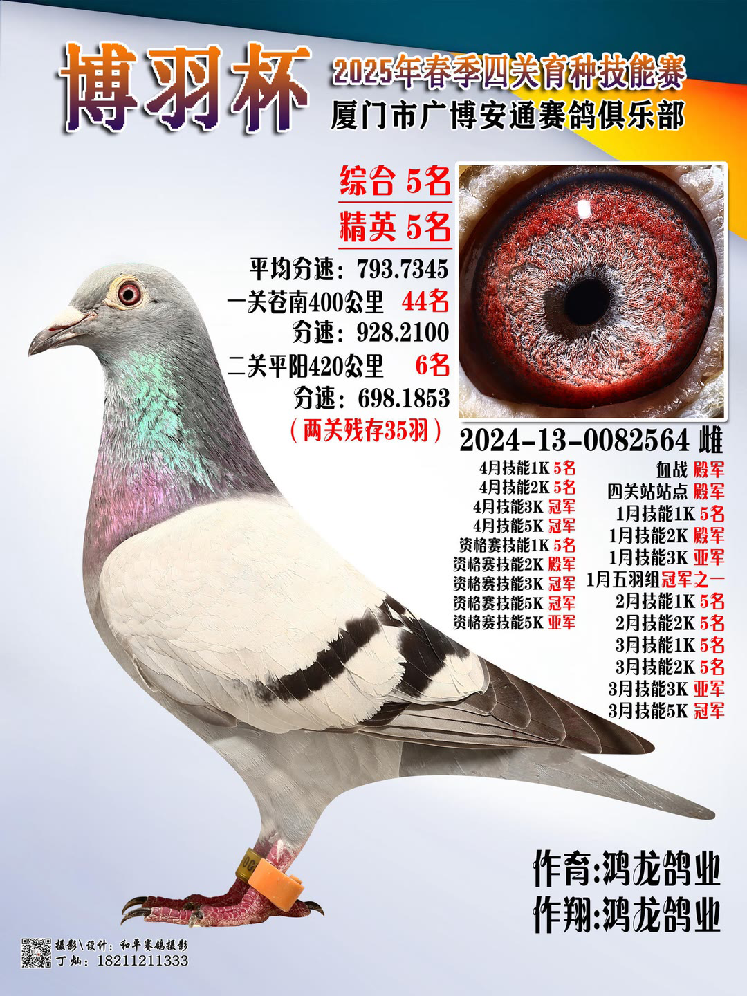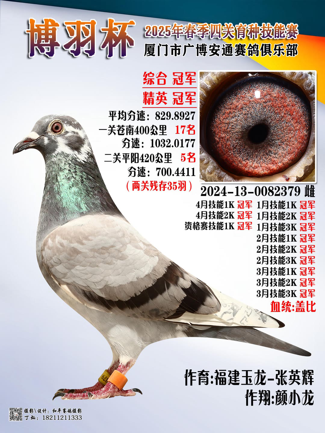 来自颜小龙的赛鸽2024-13-0082379(花雌),凭借首关第17名、第二关第5名,一举斩获本届赛事鸽王冠军及精英赛冠军,表现堪称惊艳。