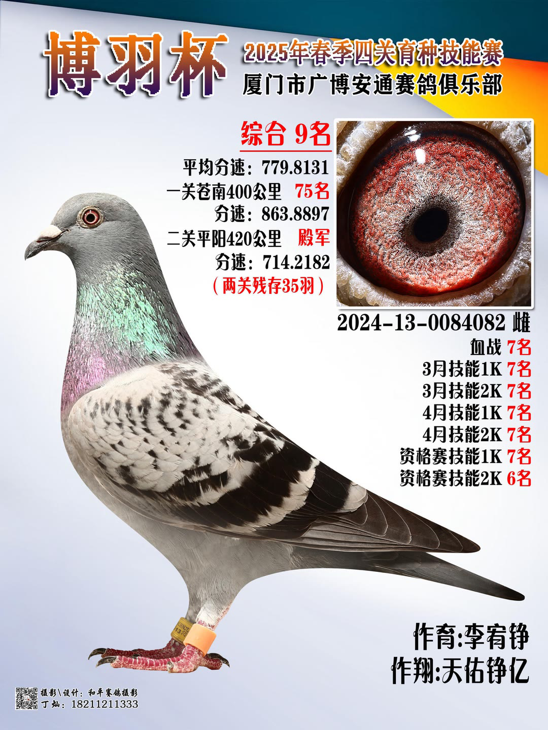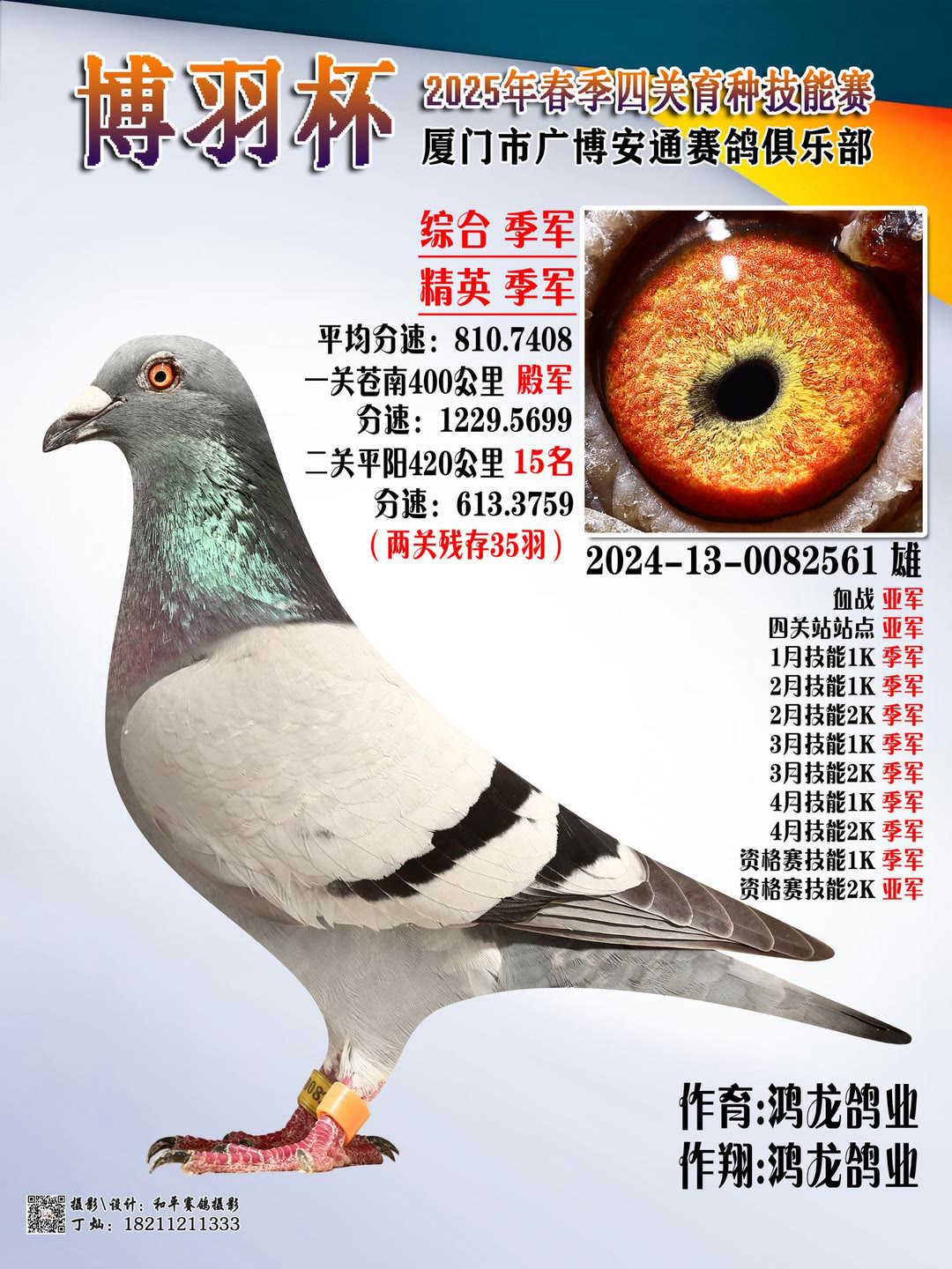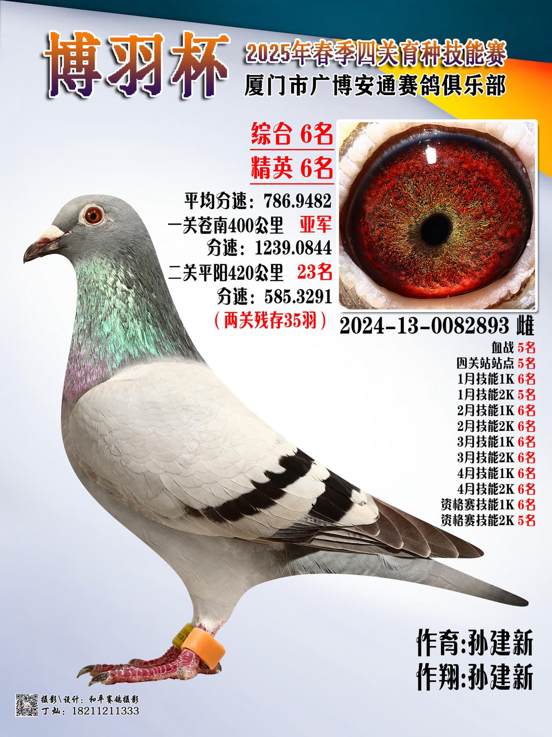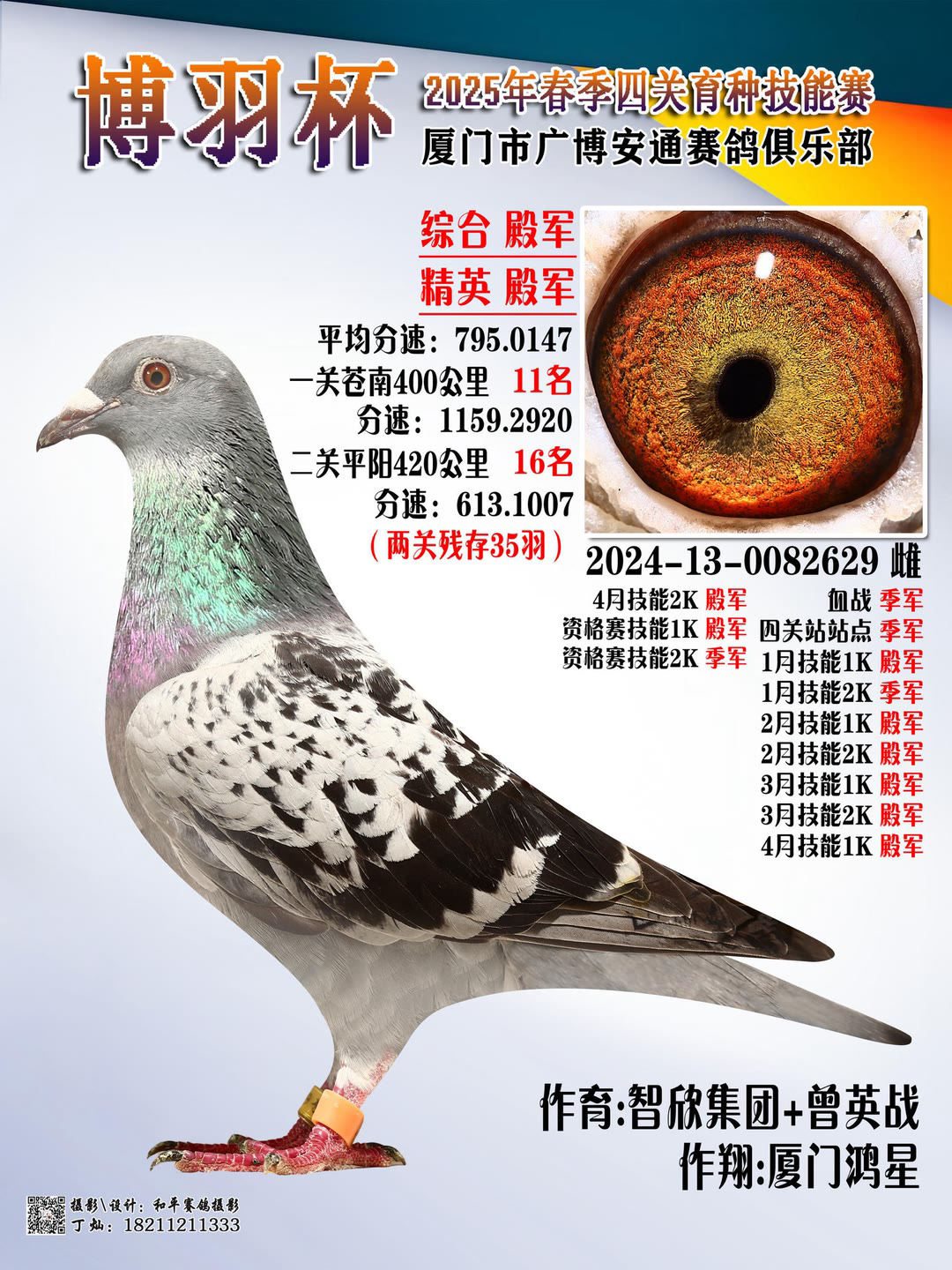 来自颜小龙的赛鸽2024-13-0082379(花雌),凭借首关第17名、第二关第5名,一举斩获本届赛事鸽王冠军及精英赛冠军,表现堪称惊艳。