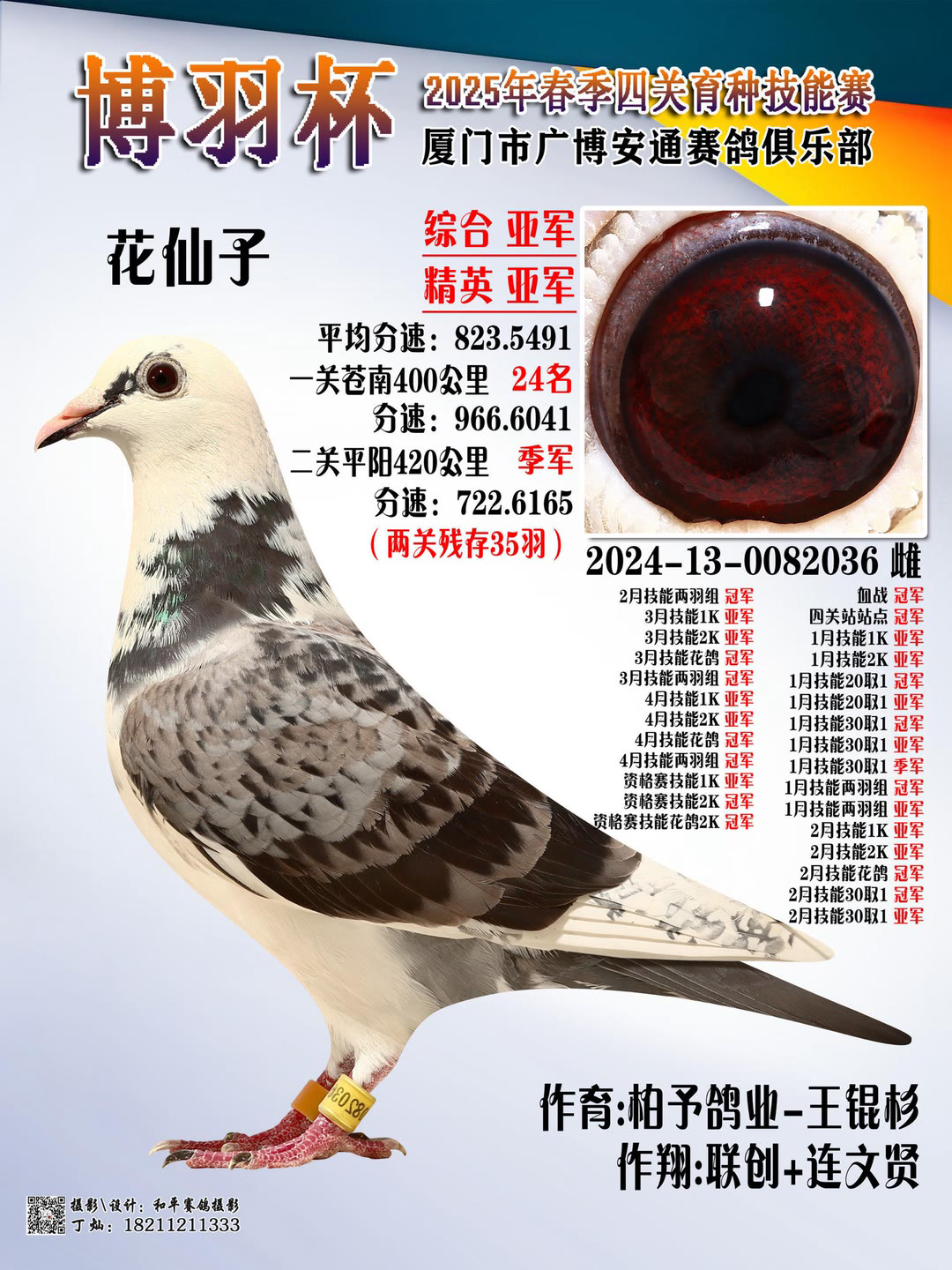 另一羽闪耀全场的赛将来自联创+连文贤团队,赛鸽2024-23-0082036(花雌)同样表现不俗,以首关第24名、第二关季军的优异成绩,勇夺鸽王亚军及精英赛亚军。这羽雌鸽名为“花仙子”,羽色靓丽,十分有特点。