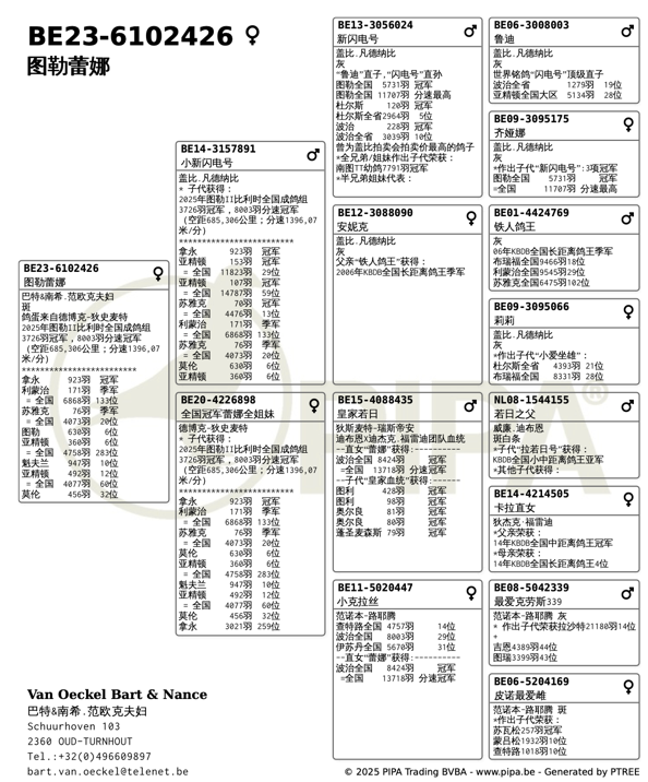 “图勒蕾娜”的加冕时刻,与其祖父“新闪电号”在14年图勒赛场的辉煌遥相辉映!当年,“新闪电号”勇夺图勒全国一岁鸽组(5731羽)冠军及全场11707羽最高分速!时隔11年,血脉在同一顶级赛场再登王座,这正是“新闪电号”血脉强大力量与不朽传奇的最强印证!