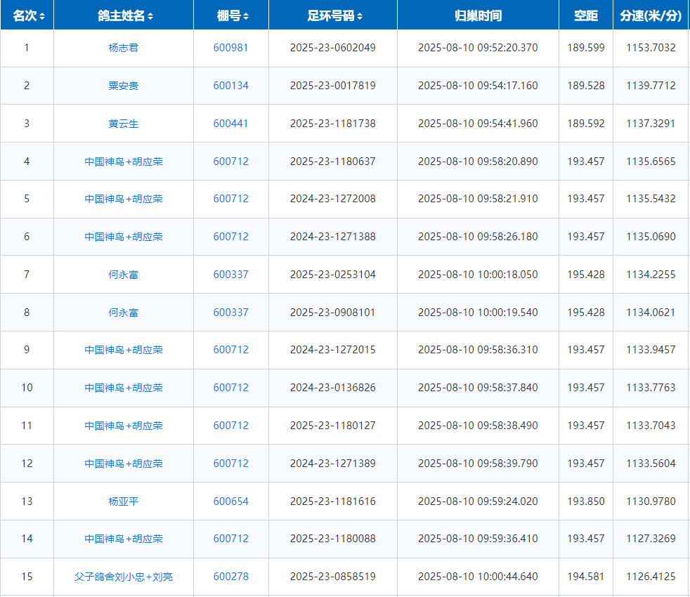 鸽友粟安贵拿下亚军,他的一羽2025-23-0017819于9时54分报进,分速1139.7712米/分,空距189.528公里。