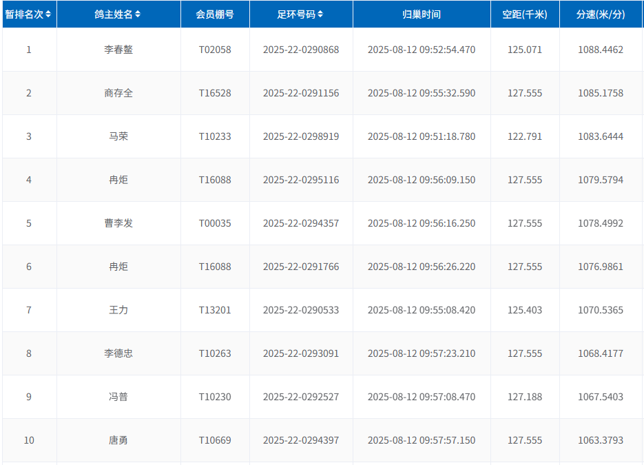 亚军马荣,环号2025-22-0298919,打钟时间09:55,飞行空距122.791公里,分速1083.6444米/分。