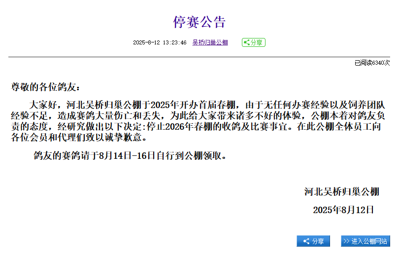 8月12日下午13点,河北吴桥归巢公棚发布一则通知,宣布暂停2026年首届春赛:由于公棚今年开办首届春棚,无任何办赛经验以及饲养团队经验不足,造成赛鸽大量伤亡和丢失,遂决定停止2026年春棚的收鸽及比赛事宜。鸽友的赛鸽请于8月14日-16日自行到公棚领取。