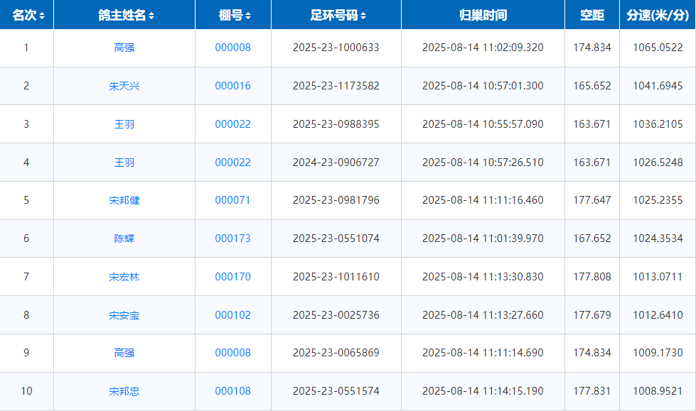 冠军:鸽友高强的一羽2025-23-1000633,于上午11时02分顺利报进,空距174.834公里,分速1065.0522米/分。