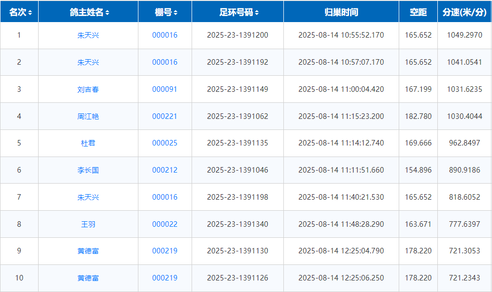 在幼鸽决赛上,鸽友朱天兴名下两羽赛鸽在11时前顺利归巢,一举包揽冠亚军。赛鸽环号2025-23-1391200,分速1049.2970米/分,拿下冠军。赛鸽环号2025-23-1391192,分速1041.0541米/分,获得亚军。