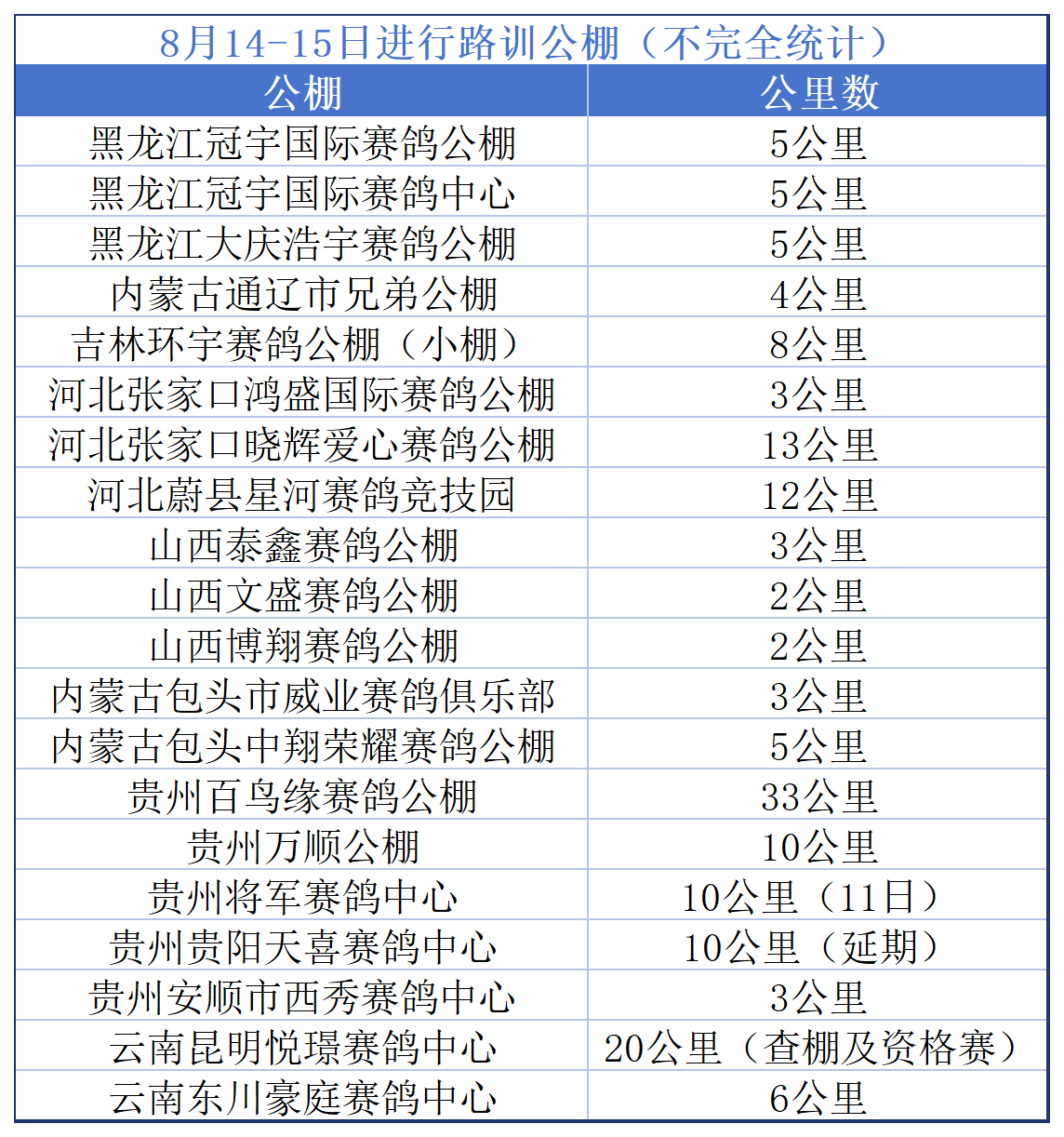 立秋后,天气渐渐凉快起来,全国各地公棚也陆续进入路训关键阶段。据不完全统计,8月14--15日,全国已有20家赛鸽秋棚已结束家飞环节,进入了路训阶段,开启了秋季竞翔前的实战演练。