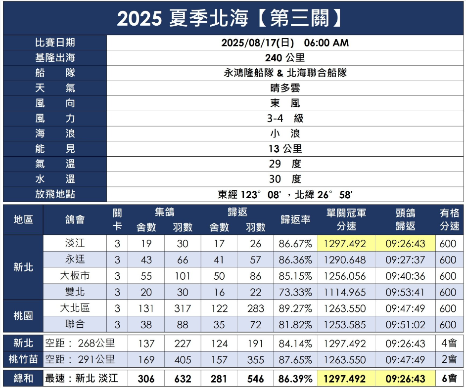 2025年8月17日,台湾夏季北海第三关开启,本关共有306舍、632羽赛鸽参赛。早上6点,台湾北海第三关在基隆出海,空距240公里,天气晴、多云,东风3-4级,伴有小浪,能见度13公里,气温29℃,水温30℃。 夏季气候变化不定,海上的风浪给小将们造成了很大的挑战,资格赛起站2万羽,仅两关过后,仅存六百余羽参赛,实在残酷。 好在本关小将们奋勇拼搏,达到超8成的归巢率,共有281舍、546羽赛鸽成功归返。单关冠军最高分速1297.492米/分,赛鸽来自新北区淡江鸽会。