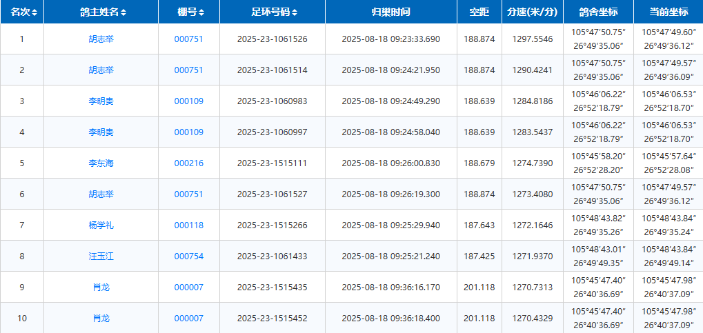 随后,李明贵鸽友名下赛鸽包揽季军、殿军,2025-23-1060983以1284.8186米/分的速度夺下季军,另一羽 2025-23-1060997获殿军。截至8月19日9点40分,共计归巢3400多羽小将,归巢超八成。点击查看直播>>