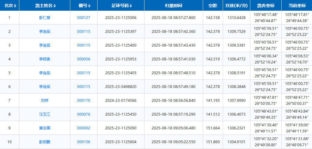 同时,李连品鸽友还包揽亚军、季军、五名、六名,飞出梦幻战绩。2025-23-1125397赛鸽以1309.7529米/分的成绩夺得亚军,另一羽2025-23-1125400以1309.5381米/分的速度摘下季军,实力不容小觑。截至8月19日9点40分,共计归巢390多羽小将,归巢近九成。点击查看直播>>