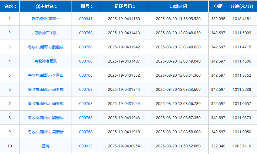 前十名中,另外9名都是粤牧神庙团队的成员,堪称梦幻团队:其中2025-19-0431413这羽赛鸽,以1011.5009米/分打钟获得亚军;粤牧神庙团队-魏继成的2025-19-0431942获得季军。