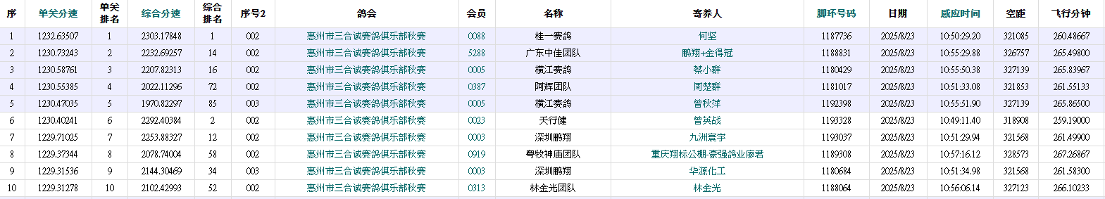 10点50分29秒,冠军揭晓。来自何坚鸽友麾下1187736赛鸽,以1232.6350米/分的成绩勇夺冠军,飞行空距321.085公里。接着,鹏翔+金得冠的1188831赛鸽于10点55分29秒报进,以1230.7324米/分的速度拿下亚军,飞行空距326.757公里。几秒后,季军则由蔡小群鸽友的1180429赛鸽摘得,平均分速1230.5876米/分,飞行空距327.139公里。