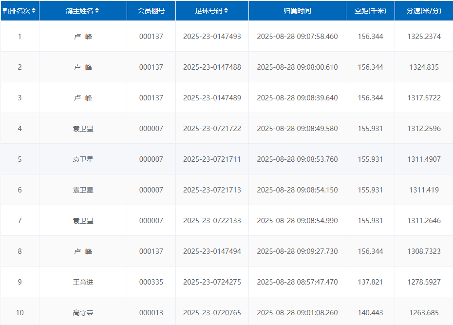 冠军:环号2025-23-0147493,分速1325.2374米/分,空距156公里。