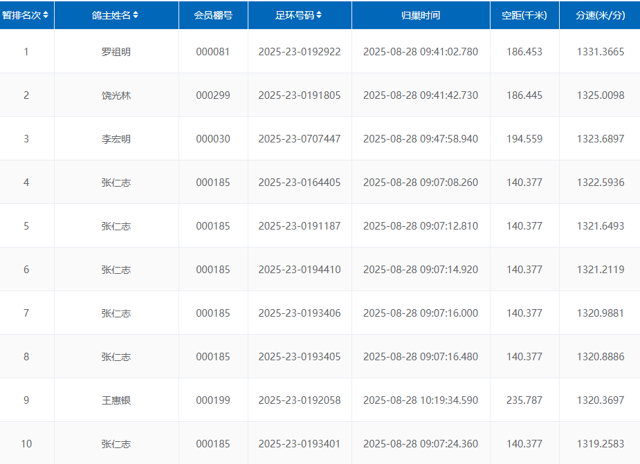 鸽友罗祖明的一羽2025-23-0192922于9时41分02秒报进,空距186.453公里,分速1331.3665米/分,斩获本场冠军。