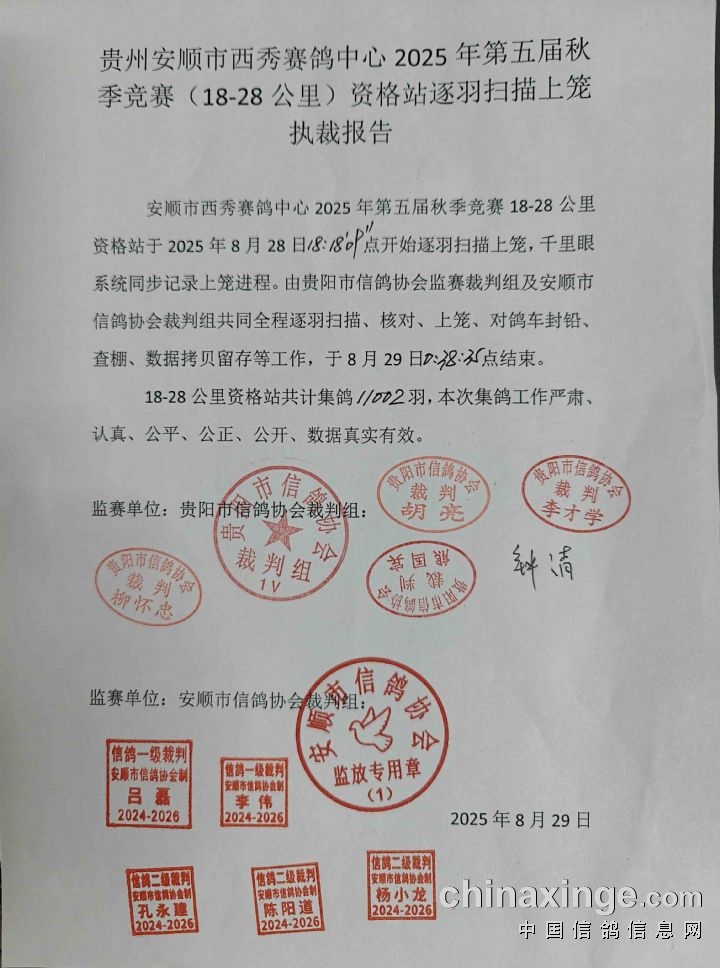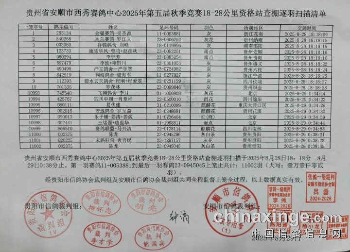 8月29日,贵州安顺市西秀赛鸽中心2025年第五届秋赛(18-28公里)资格赛开笼,本次共集鸽11002羽,于早晨8点28分在长顺县司放,参考空距19.35公里。