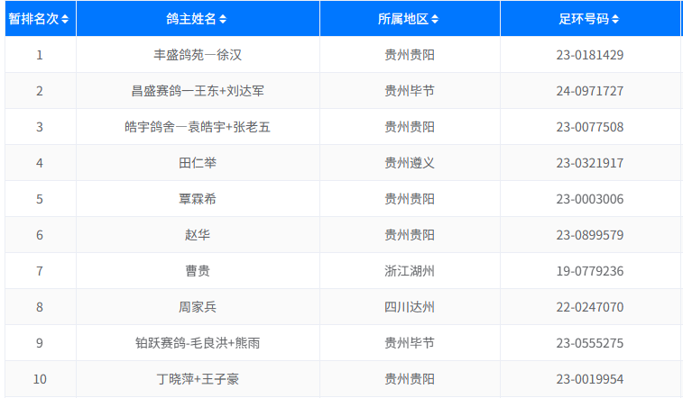 归巢消息:不到20分钟,赛鸽们就已凯旋。贵阳鸽友丰盛鸽苑—徐汉名下的23-0181429绛鸽率先打钟归巢,以1136.2737米/分的分速夺冠;昌盛赛鸽一王东+刘达军的24-0971727雨点获亚军;皓宇鸽舍—袁皓宇+张老五获季军。