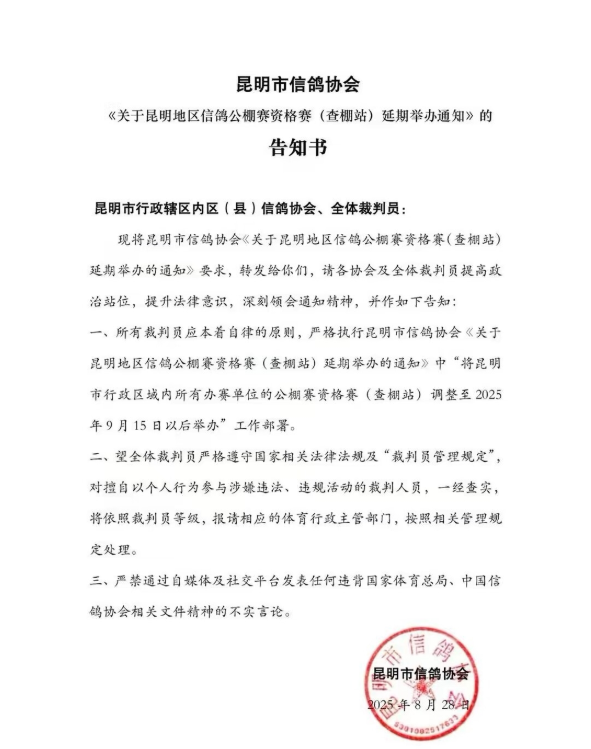 根据中国信鸽协会《关于暂停"指定赛"的函告》精神,结合 2025 年夏季以来昆明地区持续多雨天气的实际情况,为确保赛事安全及合规性,现就昆明市行政区域内所有公棚赛资格赛(查棚站)举办计划调整有关事项通知如下: