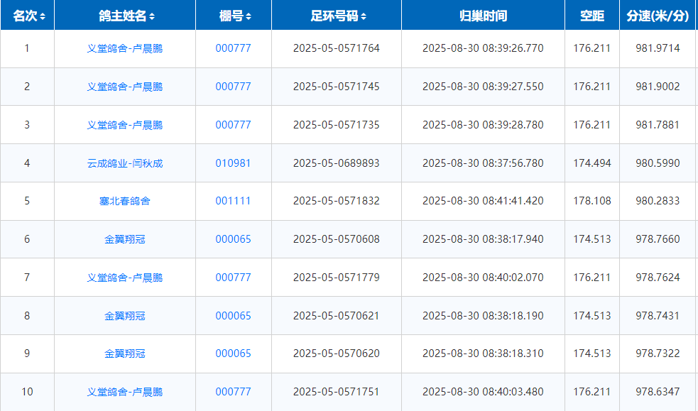其中冠军环号2025-05-0571764,分速981.9714米/分,空距176.211公里;亚军环号2025-05-0571745,分速981.9002米/分;季军环号2025-05-0571735,分速981.7881米/分。除此以外,该鸽友另还获得了7名、10名、11名、14名等高位名次,展现出极强的的赛鸽实力。