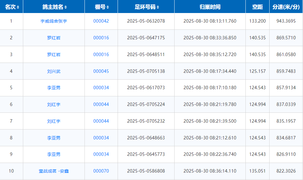 早晨8时13分,鸽友宇威鸽舍张宇的一羽2025-05-0632078率先归巢,分速943.3695米/分,空距133.2公里,拿下本场冠军。