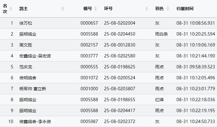 亚军是振明鸽业的25-08-0204450的雨白条飞行空距266.024公里,分速1396.99米/分。季军周文胜的25-08-0012830灰鸽,飞行空距263.782公里,分速1394.9131米/分。