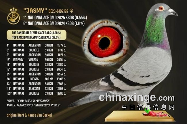 范欧克夫妇(Van Oeckel Bart & Nance)以成熟战将BE23-6102192(系数0.55%)统治中距离战场!波治II、III稳居前15,亚精顿I、III赛场接连斩获B3大区亚军、冠军,战力惊人,积分遥遥领先,无可争议加冕中距离成鸽组鸽王,铸就家族荣耀。