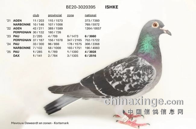 德维德家族(Deweerdt Mevr. & Zonen)以一羽超长距离战神BE20-3020395(系数0.302%)震撼全场!在波城国际赛(895.4公里)勇夺大区冠军,达克斯国际赛(874公里)再斩大区季军,跨越近900公里远征,以钢铁意志与极致耐力,强势登顶超长距离成鸽组鸽王,尽显王者风范。