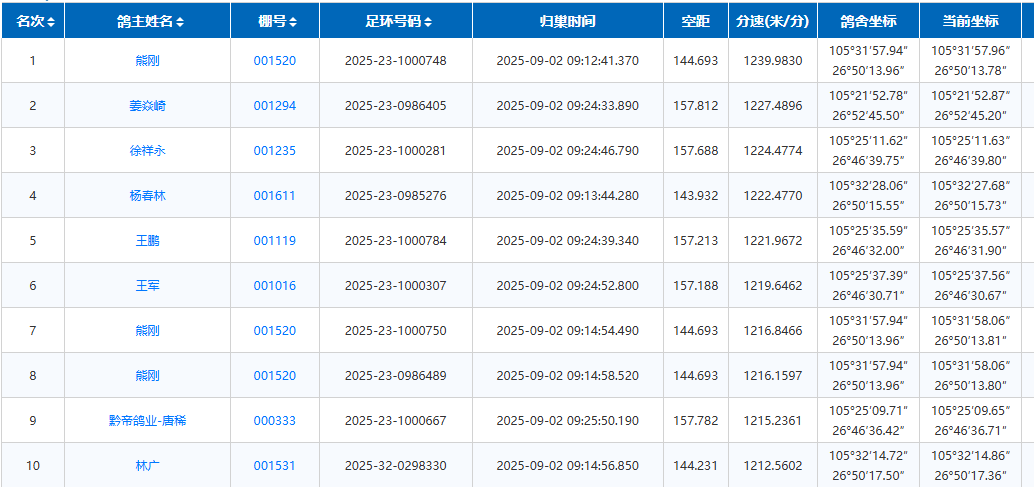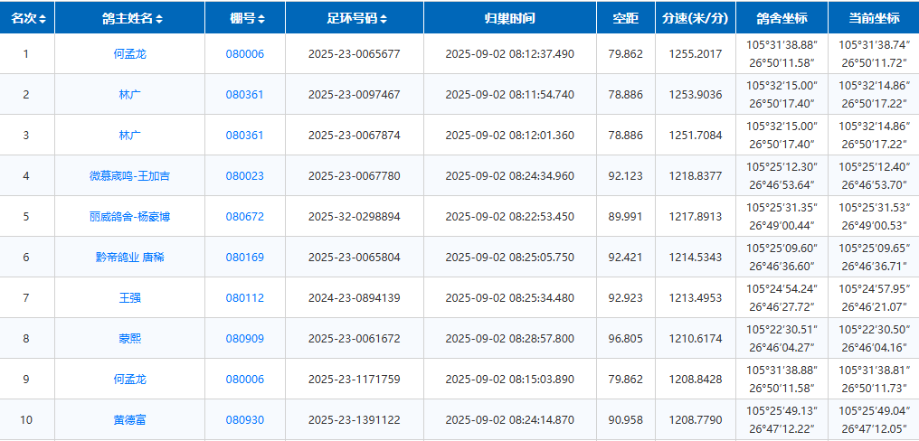 仅一个多小时,捷报传来。鸽友何孟龙的赛将2025-23-0065677率先归巢,以1255.2017米/分的成绩勇夺冠军,其另一羽2025-23-1171759也跻身前十,荣获第九名,表现亮眼。