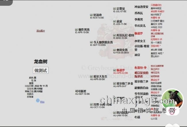 “龙血树”母犬,近期在澳大利亚吉隆赛道获得400米优胜。这个母犬也是多次近亲交配做出的,他的父亲就是“爆炸男孩儿”,也是一只冠军狗,被天津天佑犬业收藏。