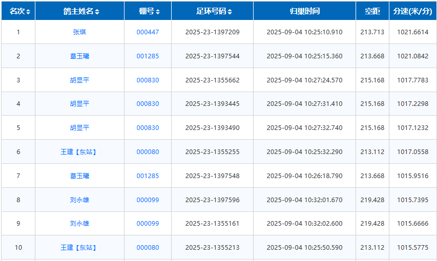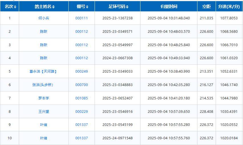 贵州毕节七星关区碧海信鸽俱乐部,第三届南北飞一关江津站,于9月4号早晨6点56分开笼,共集鸽1323羽,参考空距213公里。10点半左右见鸽归巢,冠军是张琪的2025-23-1397209,打钟时间10:25:10,飞行空距213.713公里,分速1021.6614米/分。亚军葛玉曦、季军胡显平,截至11点,已有160多羽赛鸽打钟归来。直播链接>>