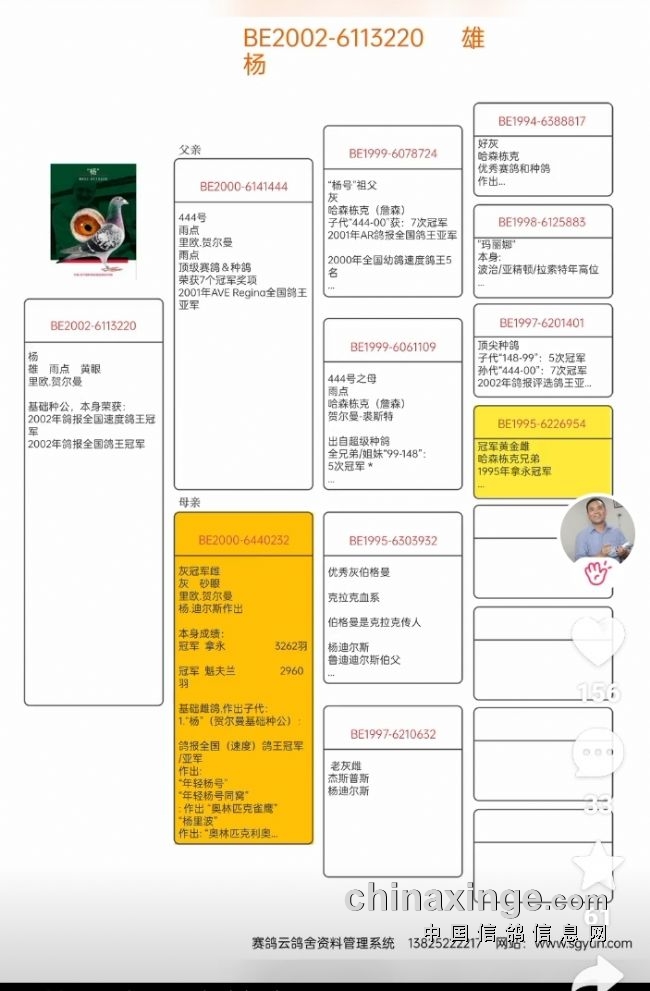 杨的父亲,3个四就是一只黄眼鸽,7次冠军。
