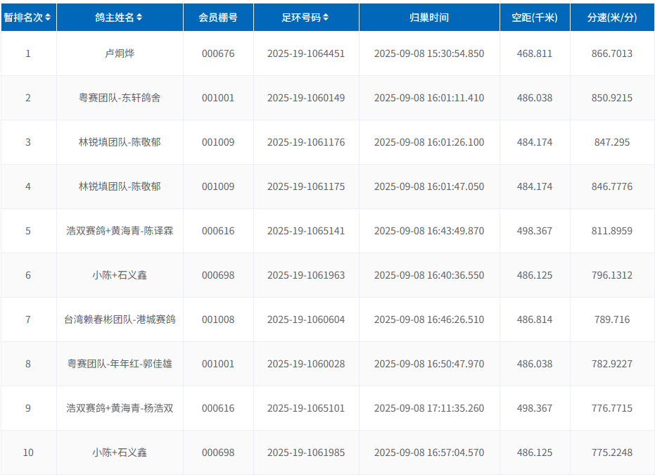 揭阳联翔赛鸽俱乐部归巢消息:想要顺利归巢并不容易。当天下午三点半,卢炯烨的2025-19-1064451单枪匹马率先归巢,以866.7013米/分的分速获得冠军。16:01:11,三羽赛鸽几乎同时打钟:粤赛团队-东轩鸽舍的2025-19-1060149,分速850.9215米/分获得亚军;林锐填团队-陈敬郁名下的两羽2025-19-1061176、2025-19-1061175分别获得季军、殿军。当天仅归巢50羽赛鸽。揭阳联翔赛鸽俱乐部直播链接>>