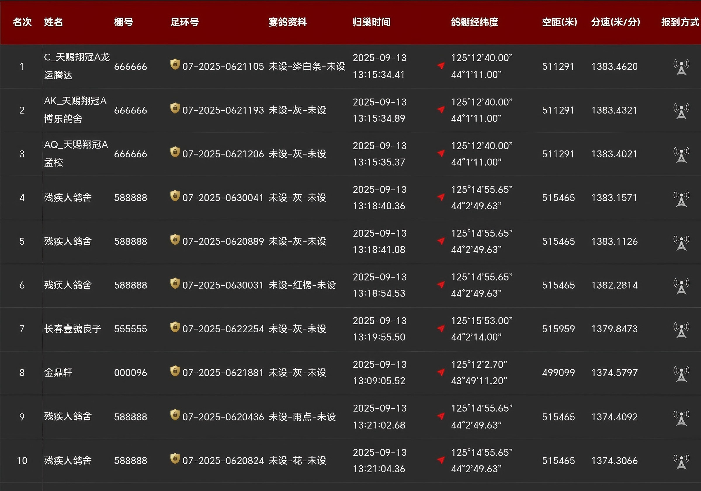 除此以外,残疾人鸽舍(棚号588888)表现也十分优异,包揽了4至6名、9至10名的高位,前十占据了五个名次,实力了得!