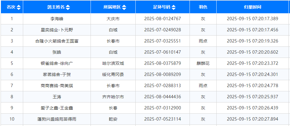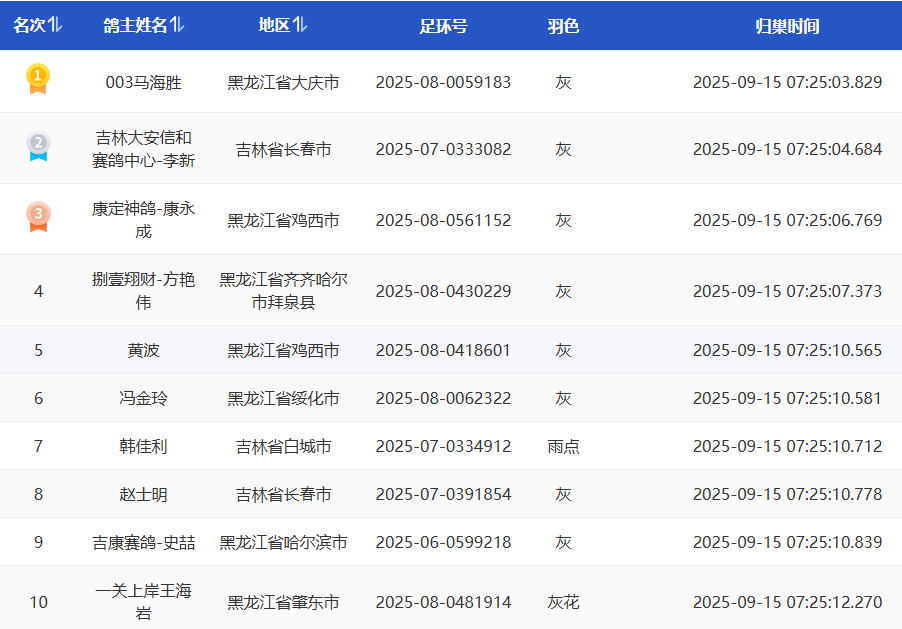亚军吉林大安信和赛鸽中心-李新的2025-07-0333082灰鸽,打钟时间07:25:04,只比冠军晚了0.1秒,分速1674.1839米/分。